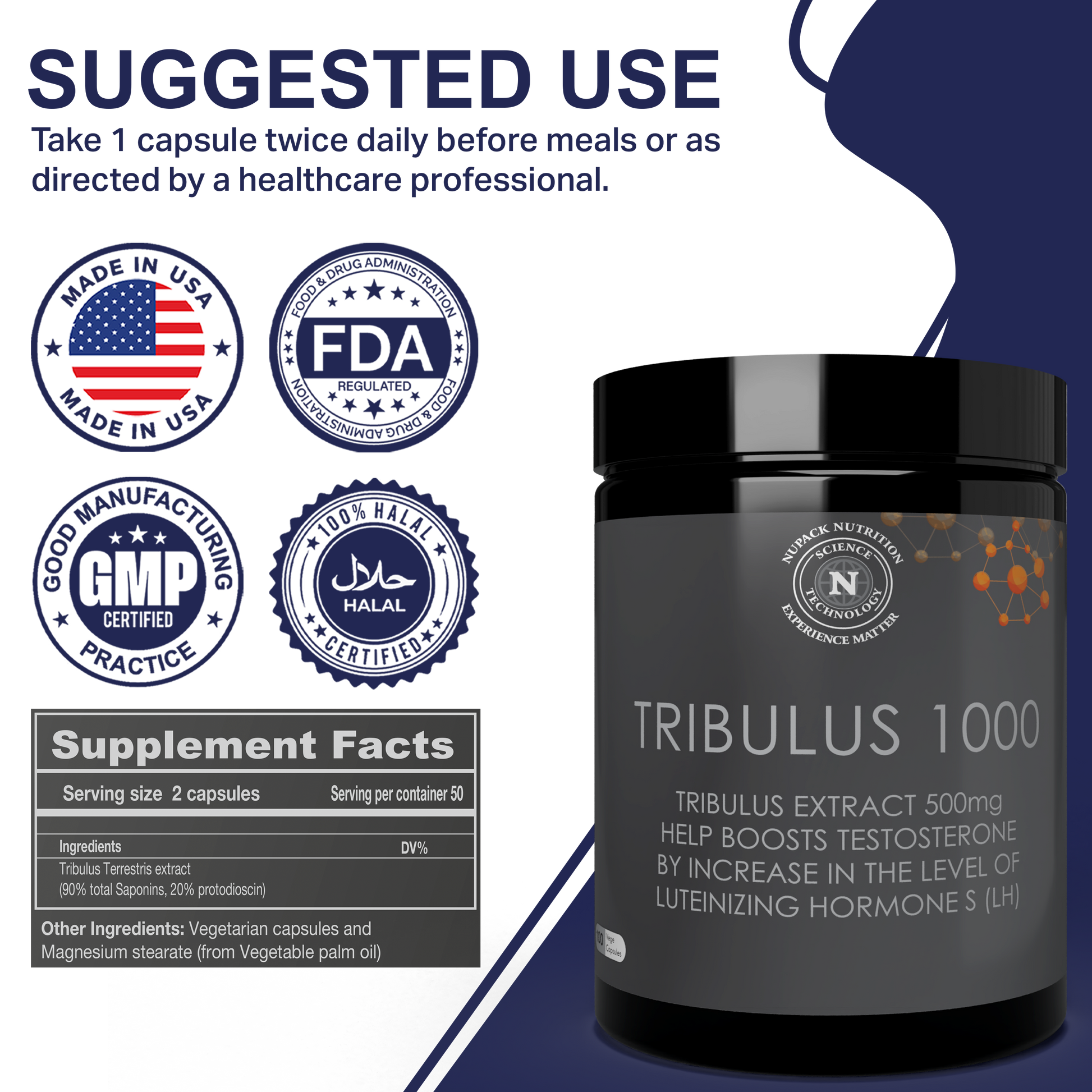 Experience the natural power of NUPACK Tribulus 1000, a premium Tribulus Terrestris extract designed to support vitality, strength, and overall performance. Formulated with 500mg of high-standardized Tribulus extract (90% saponins, 20% protodioscin), this supplement offers exceptional purity and potency.